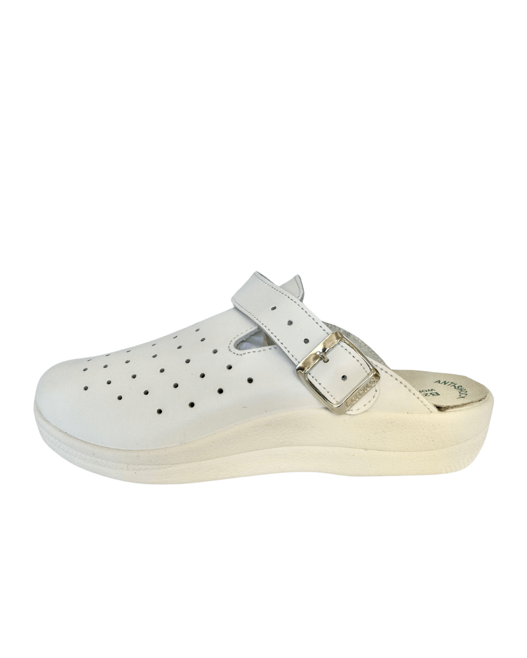 Bijele klompe s podesivim remenom – certificirana radna obuća.